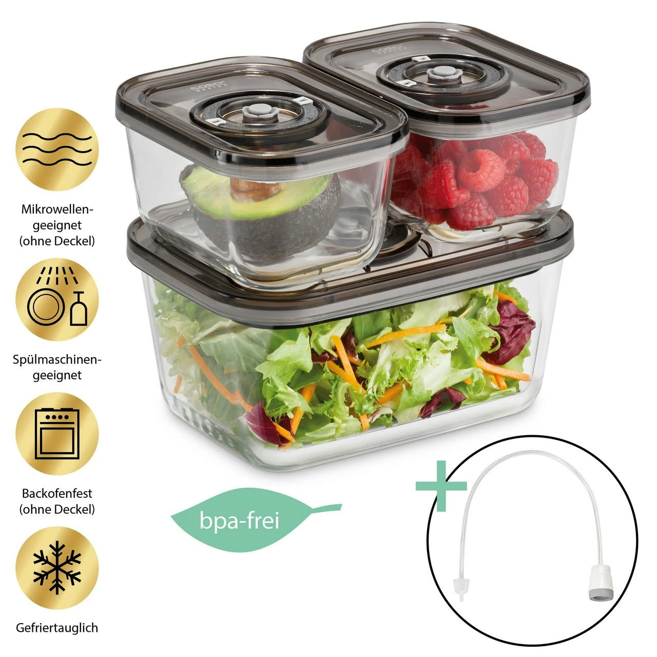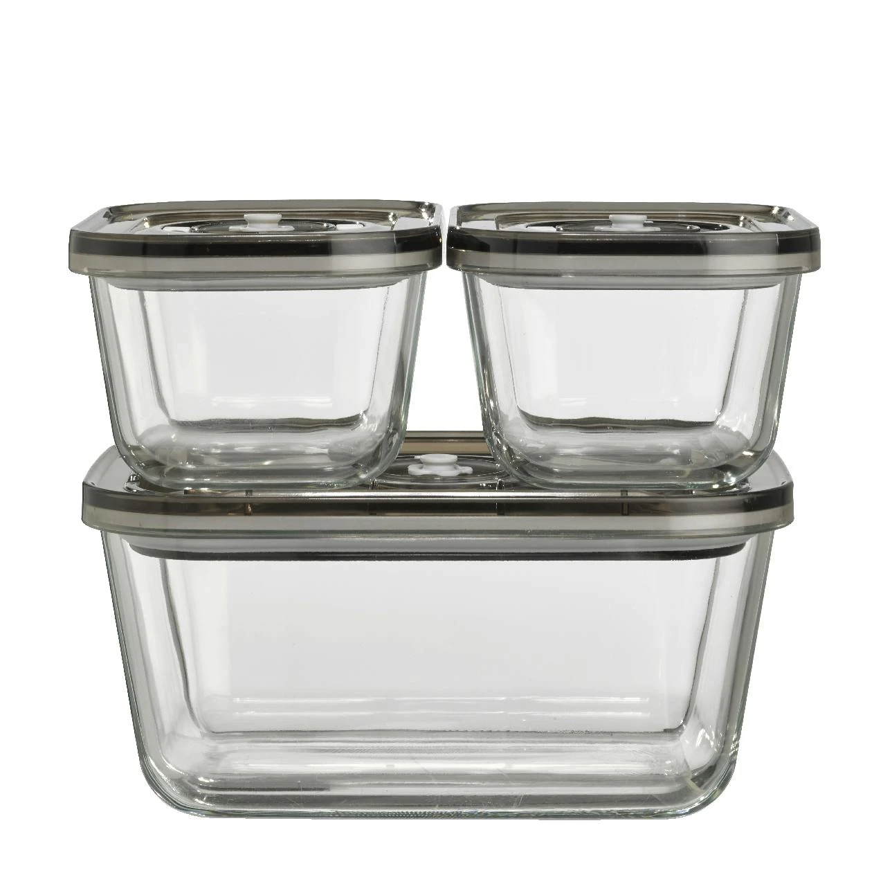 Stapelbares Vakuumbehälter-Set aus Glas mit Kunststoffdeckel. Vielseitig nutzbare und hochwertige Behälter für alle möglichen Lebensmittel. Fassungsvermögen und Maße (BxHxT): 2 x 500 ml (100 x 75 x 145 mm) und 1500 ml (145 x 95 x 200 mm).