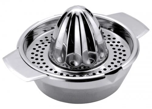 Orangensaftpresse, aus verchromtem Zinkguss, hochglänzend, mit herausnehmbarem Einsatz aus Edelstahl 18/10, mit rückfederndem Hebel