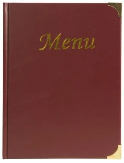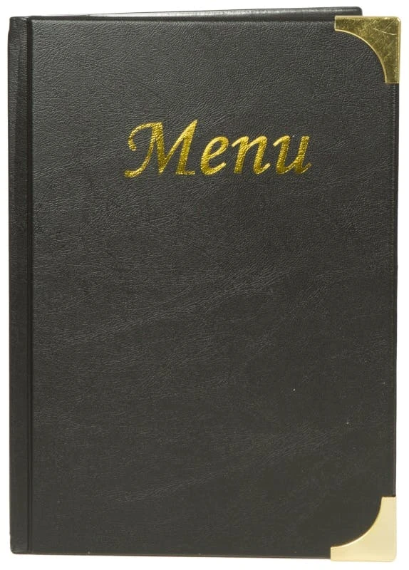 Speisekarte, einfach, Außenhülle aus PVC in Glattlederoptik, Metallschutzecken, Aufschrift „Menu“ in Goldprägedruck, abwaschbar, für maximal zehn DIN A4 Blätter (zwei Blätter in den Innenseiten der Mappe und vier doppelseitig bestückbare Einlegehüllen)