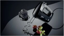 Moment-/Turbo-Stufe, ergonomisches Design, große Tasten, Soft-Touch-Gehäuse, flexibles Spiralkabel, Anschlussmöglichkeit für Stabmixer-Zubehör, sep. Auswurftaste für Rührbesen und Knethaken, inkl. 2 Premium-Turbobesen und 2 stabile Knethaken, Farbe: Schwarz/grau